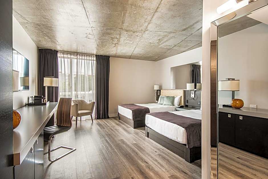This contemporary room is equipped with a work desk, 55-inch flat-screen TV and free Wi-Fi. The bathroom features a glass walled-in shower.
